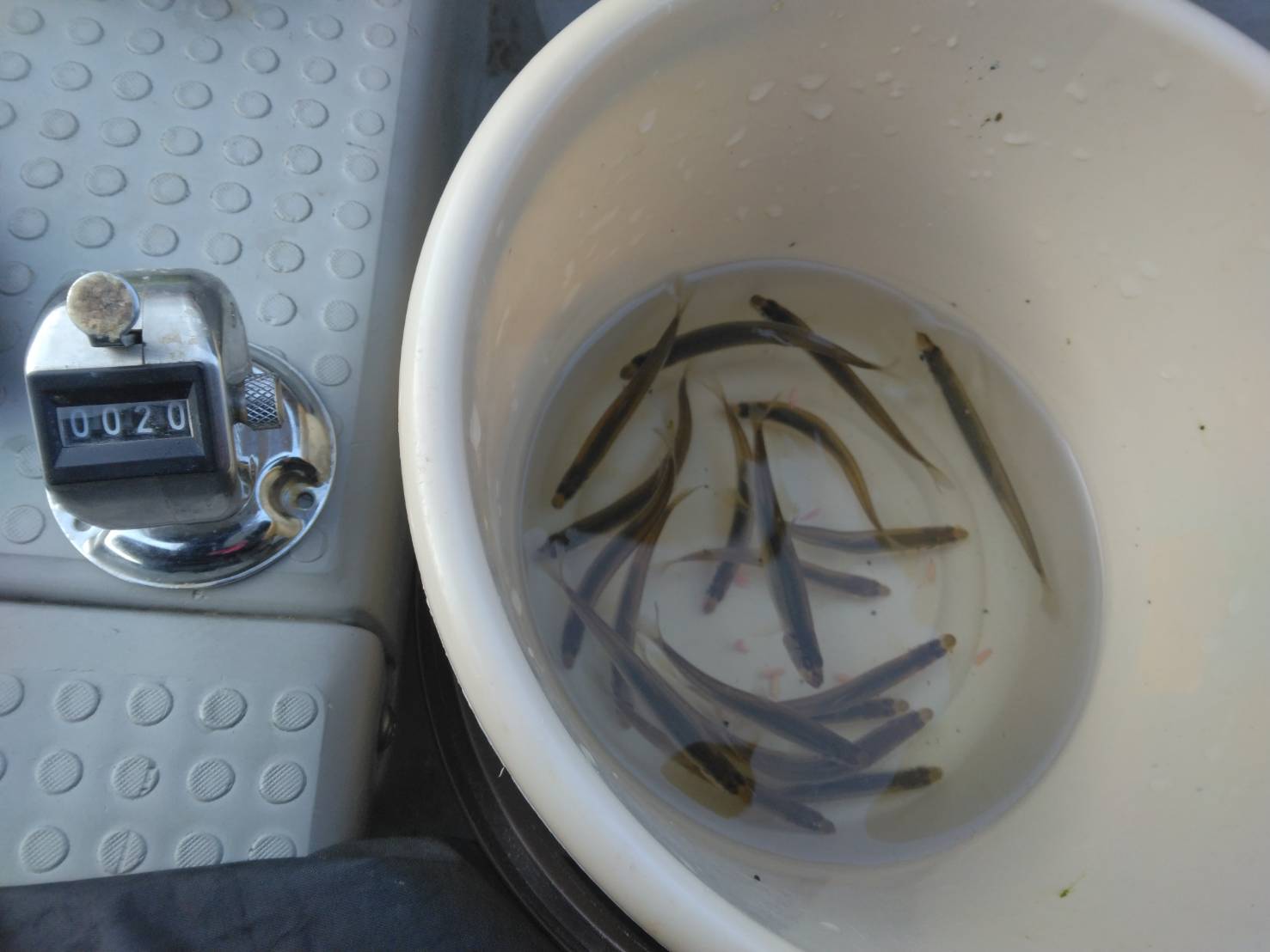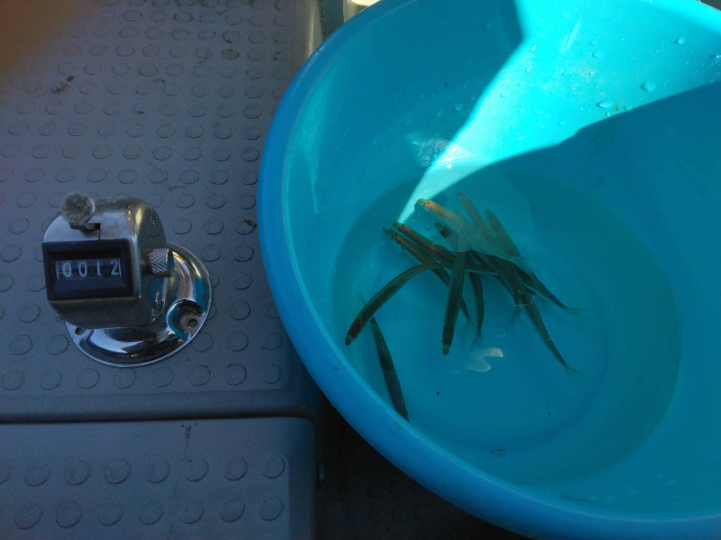 今日の夕マズメ調査 今日もカーブミラーでの調査です。底付近にはパラパラ反応があってもなかなか掛からず渋かったですが16:15頃から群れが入り釣れだしましたが16:20で終了。写真はお客様から頂いたワカサギも入っていますが夕マズメ調査は15匹でした。