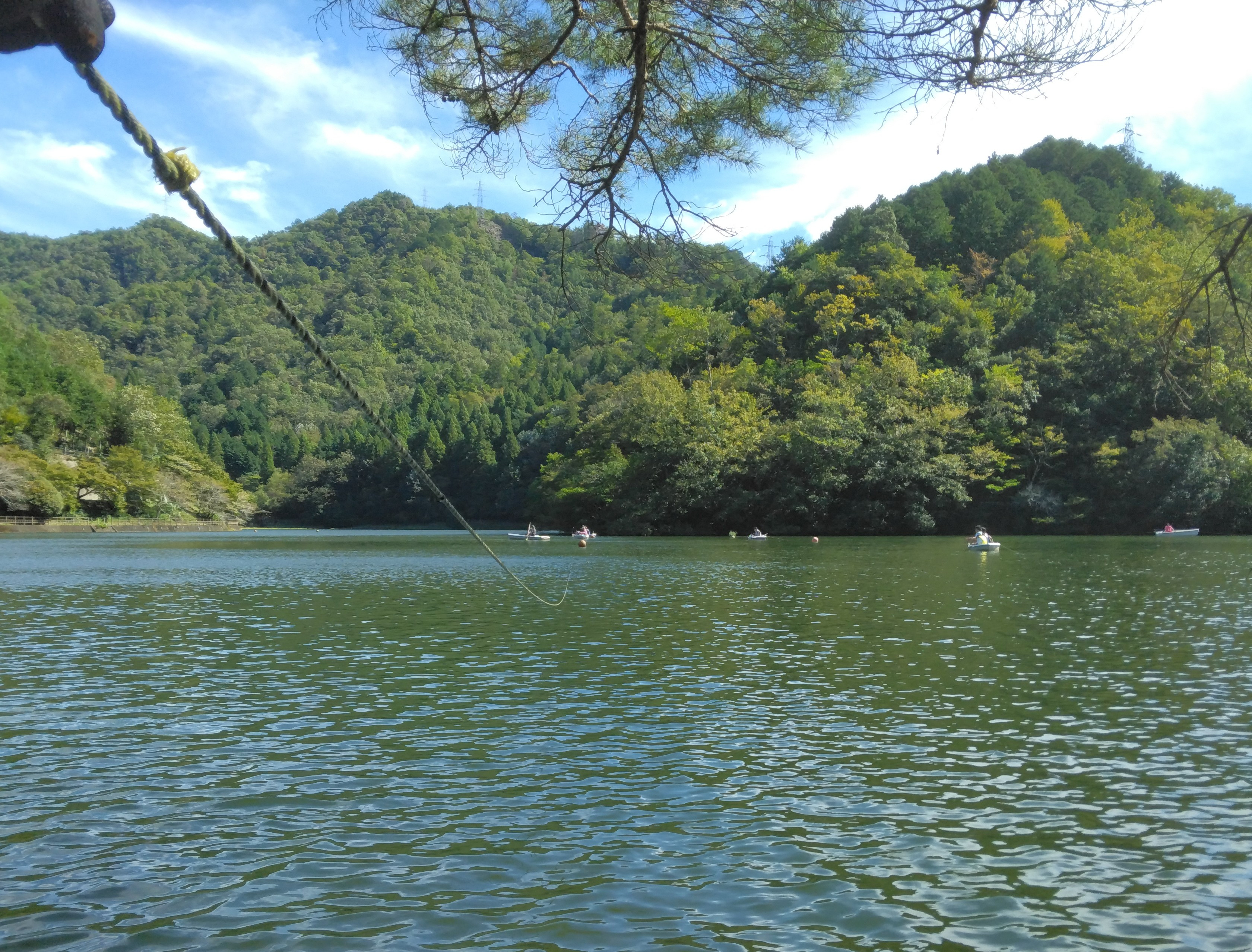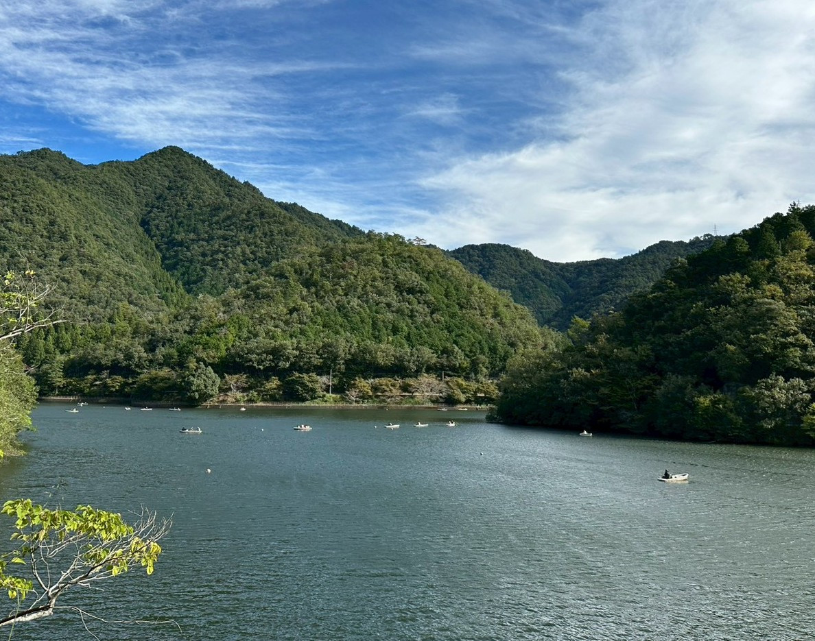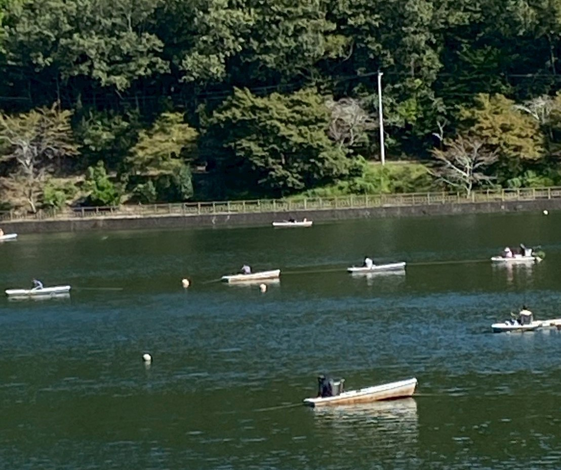 朝の伊自良湖 今日も沢山のボートが湖に出ていました。