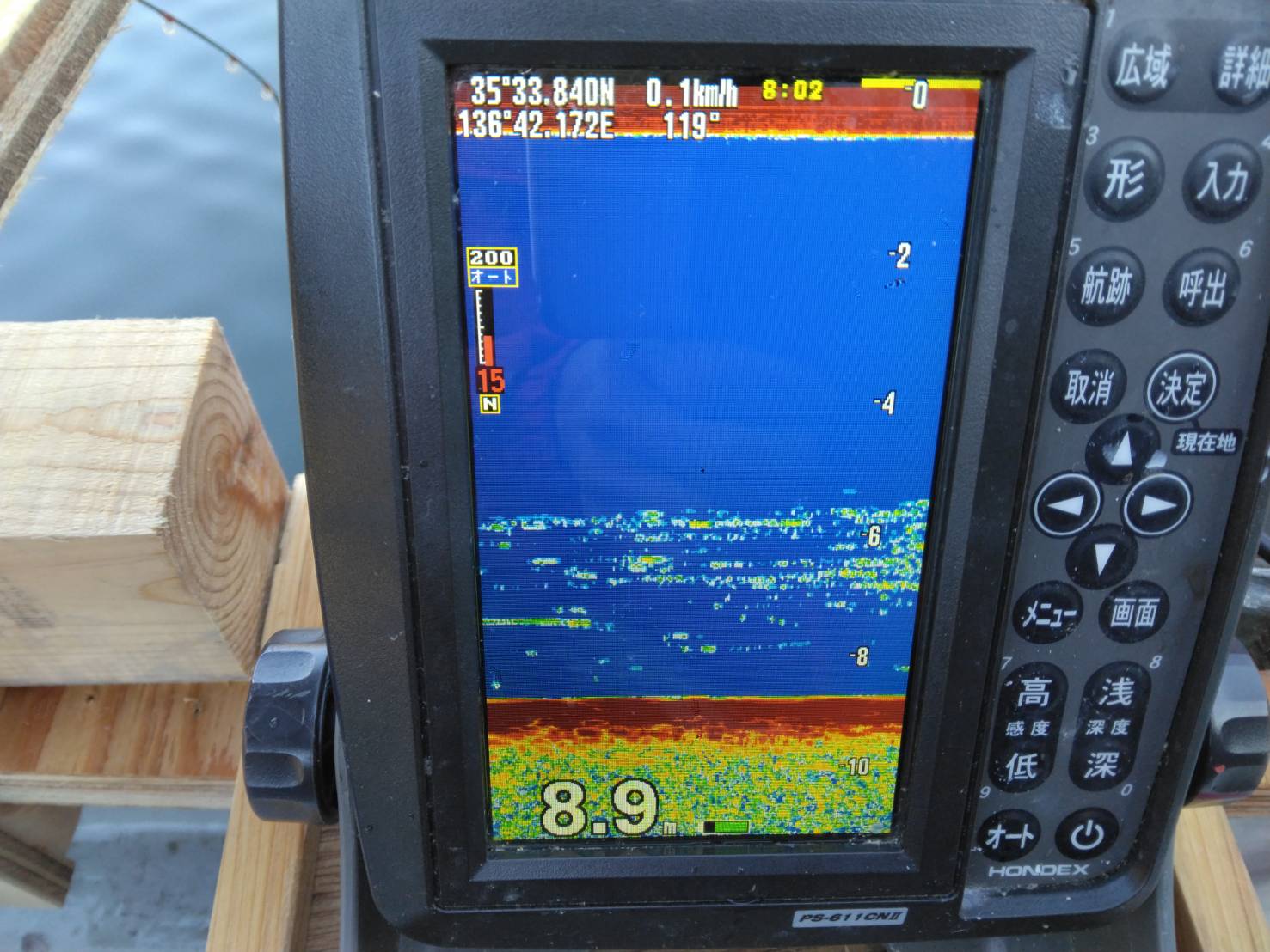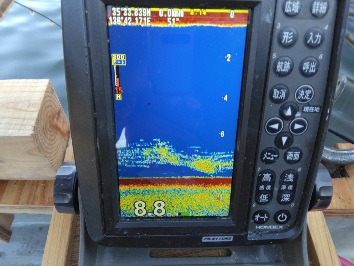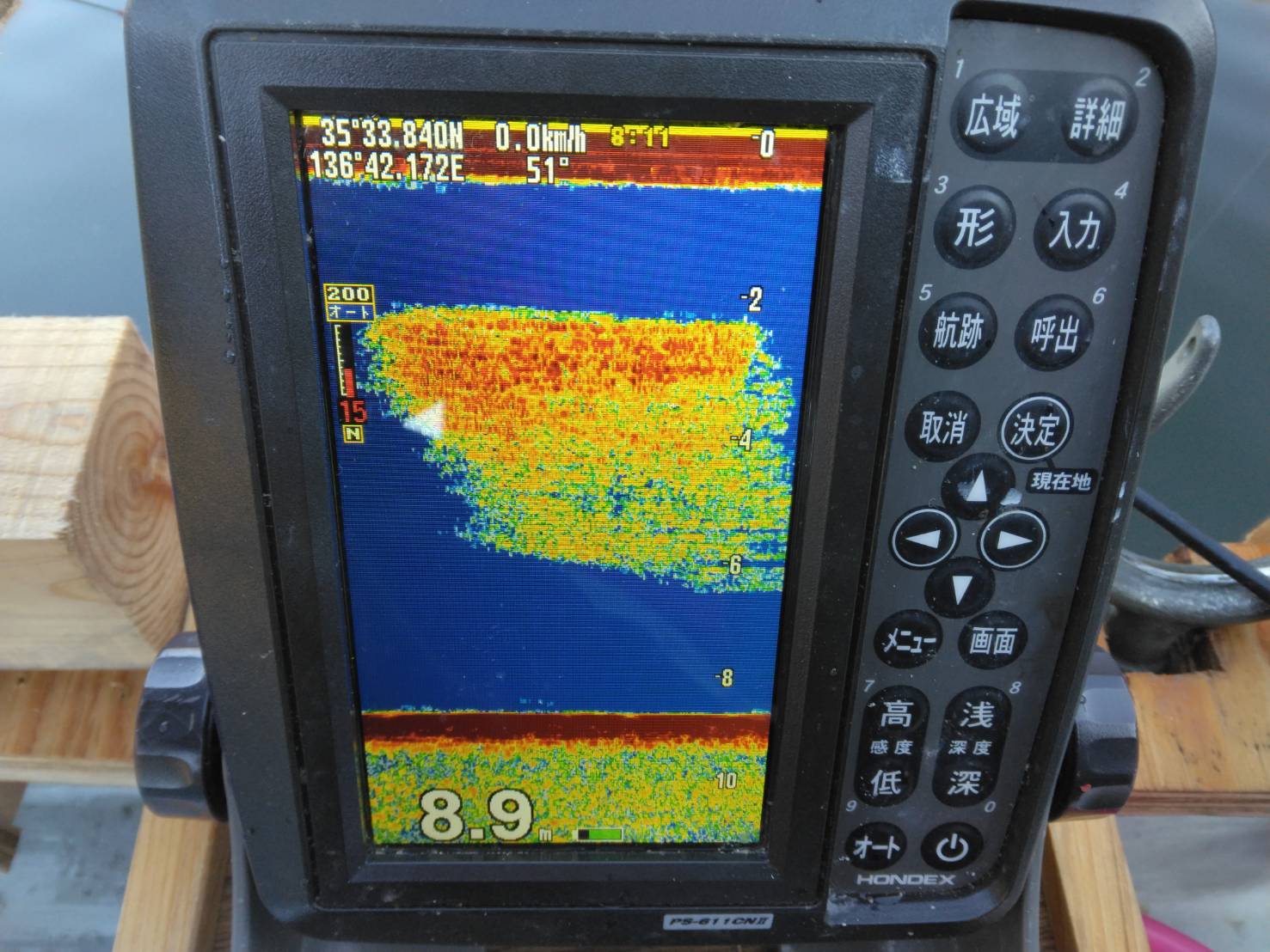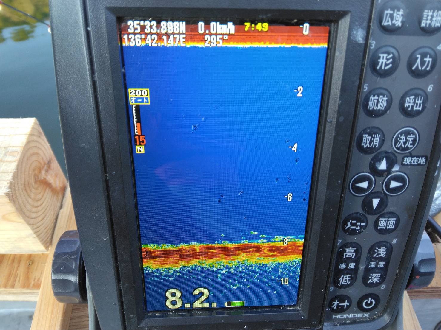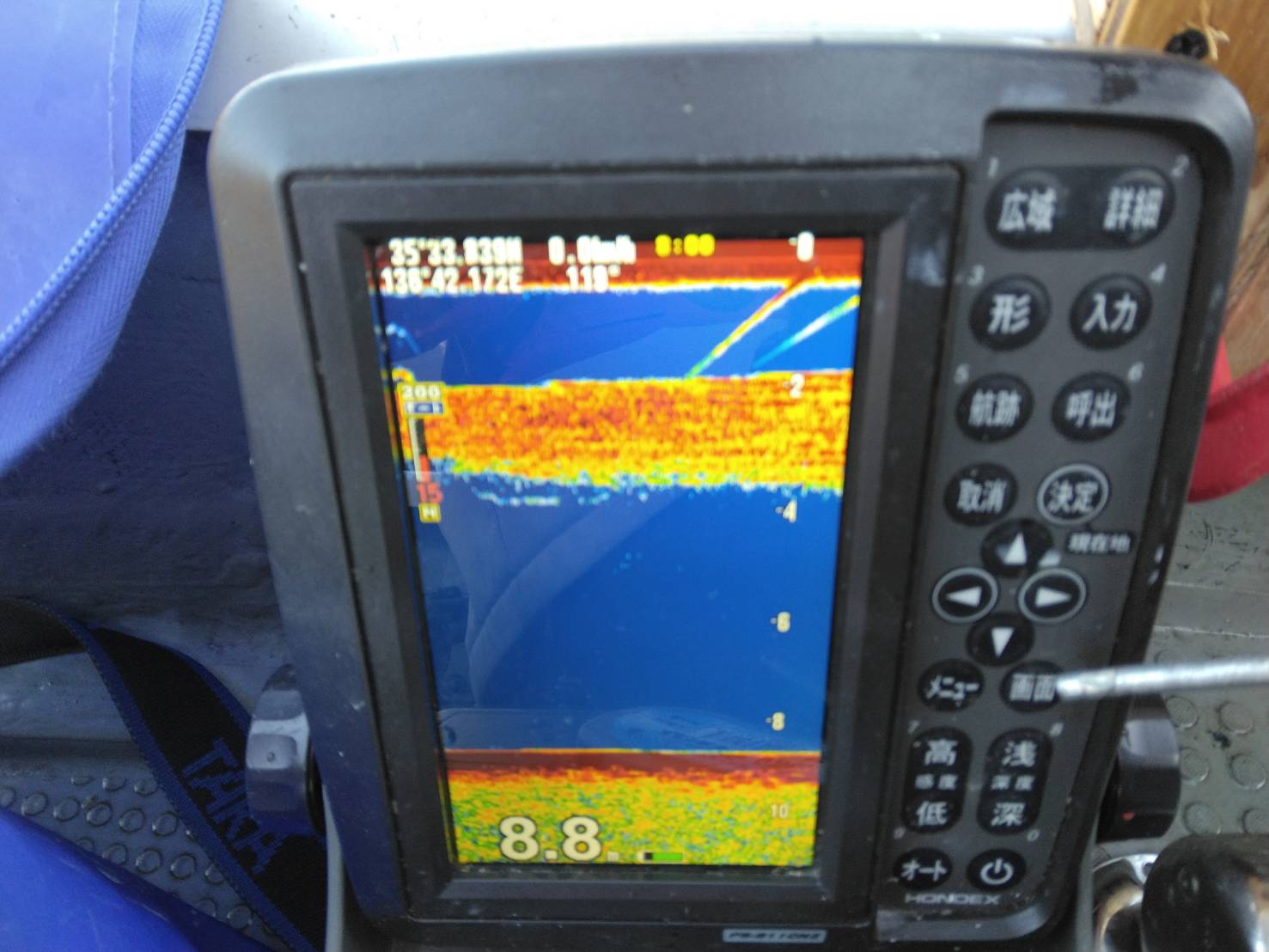 カーブミラーの魚探の反応。底でぽつぽつ掛かり7時半から8時前までで10匹でした。