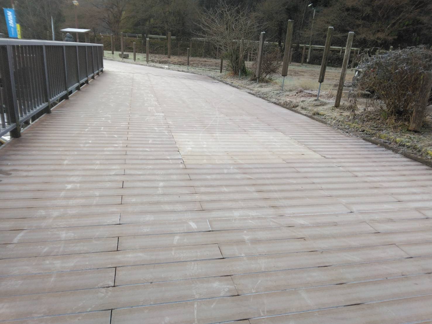 朝のウッドデッキや桟橋は霜が凍り滑りますので気をつけて下さい。