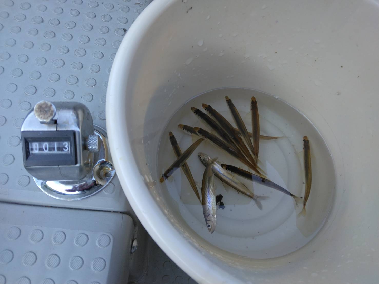 今日の夕マズメ調査は南ロープと一本杉ですが一本杉では1匹のみ、南ロープは群れが入ると鵜がすぐに寄ってきてボート周りを潜り始め釣れなくなってしまいました。ただ、今日の南ロープは4時過ぎ片づけを始める頃から底付近に群れが入り出しその後も群れが切れる事も無い状況が続いていました。もう少し早くこの状況になれば良いのですが。少し状況変化を感じたので今後が楽しみです。明日も皆さんの釣果に期待します。