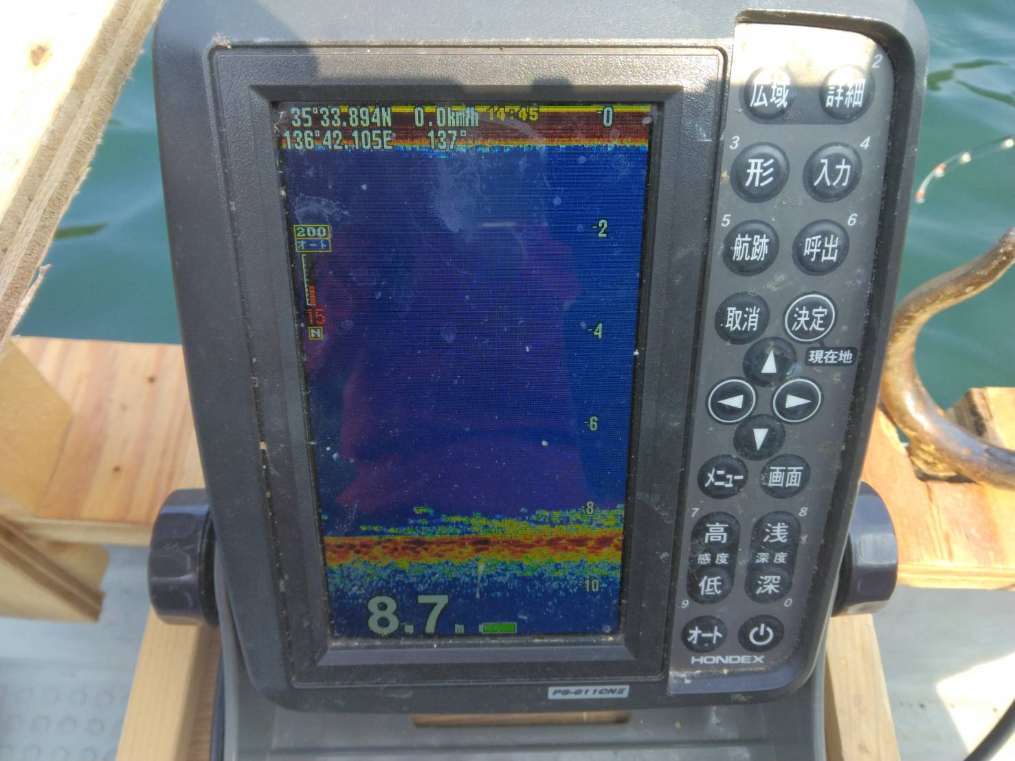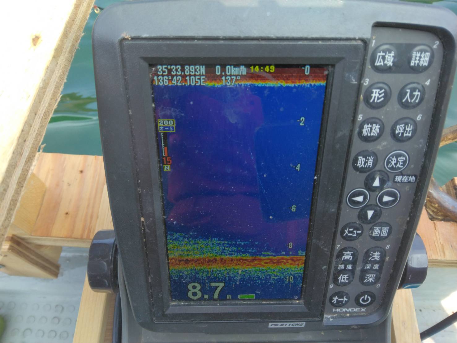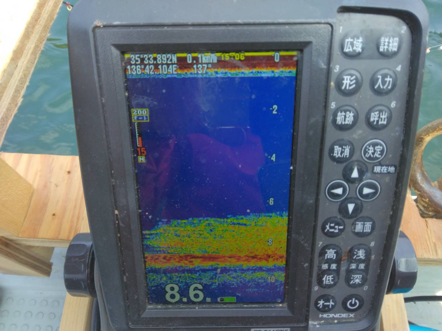 西ロープの魚探の反応です。初めはパラパラだった反応も時々群れも入ってきました。