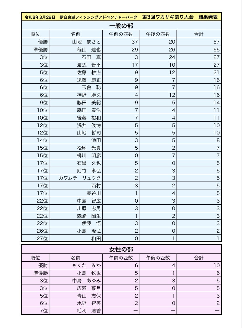 日曜日に開催したワカサギ釣り大会の結果です。多くのお客様にご参加頂きましてありがとうごさいました。