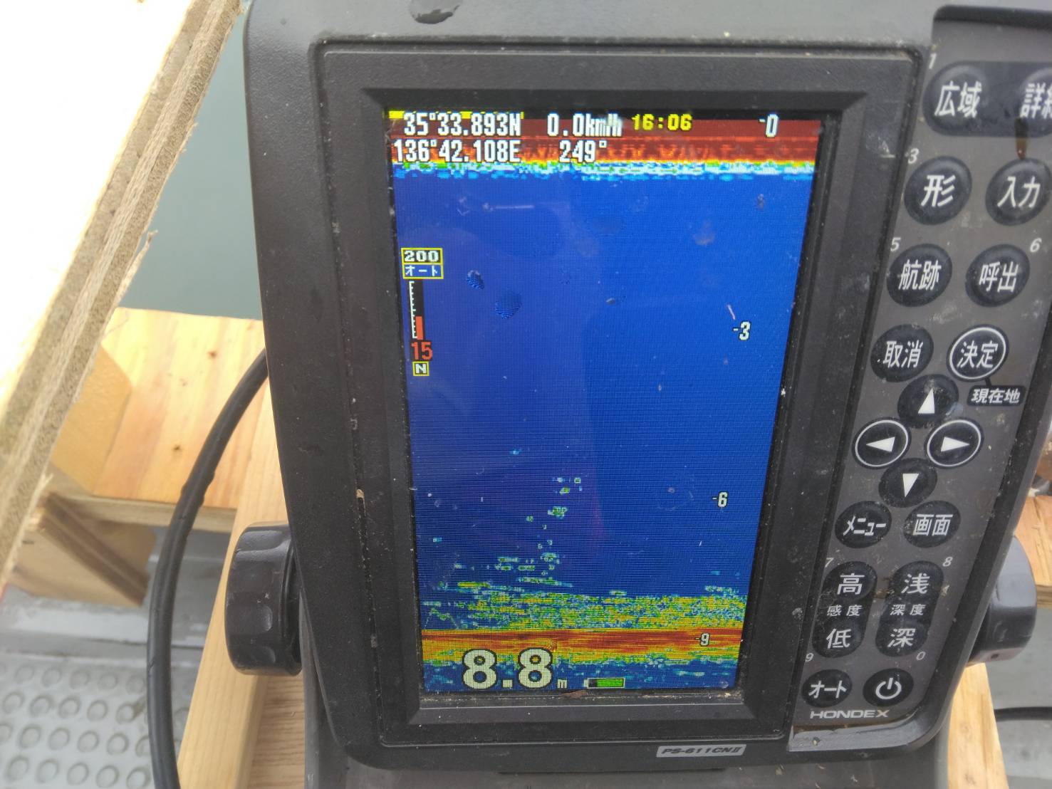 西ロープの魚探の反応。たまに群れは入るものの底付近の反応はほぼ無く6匹でした。
