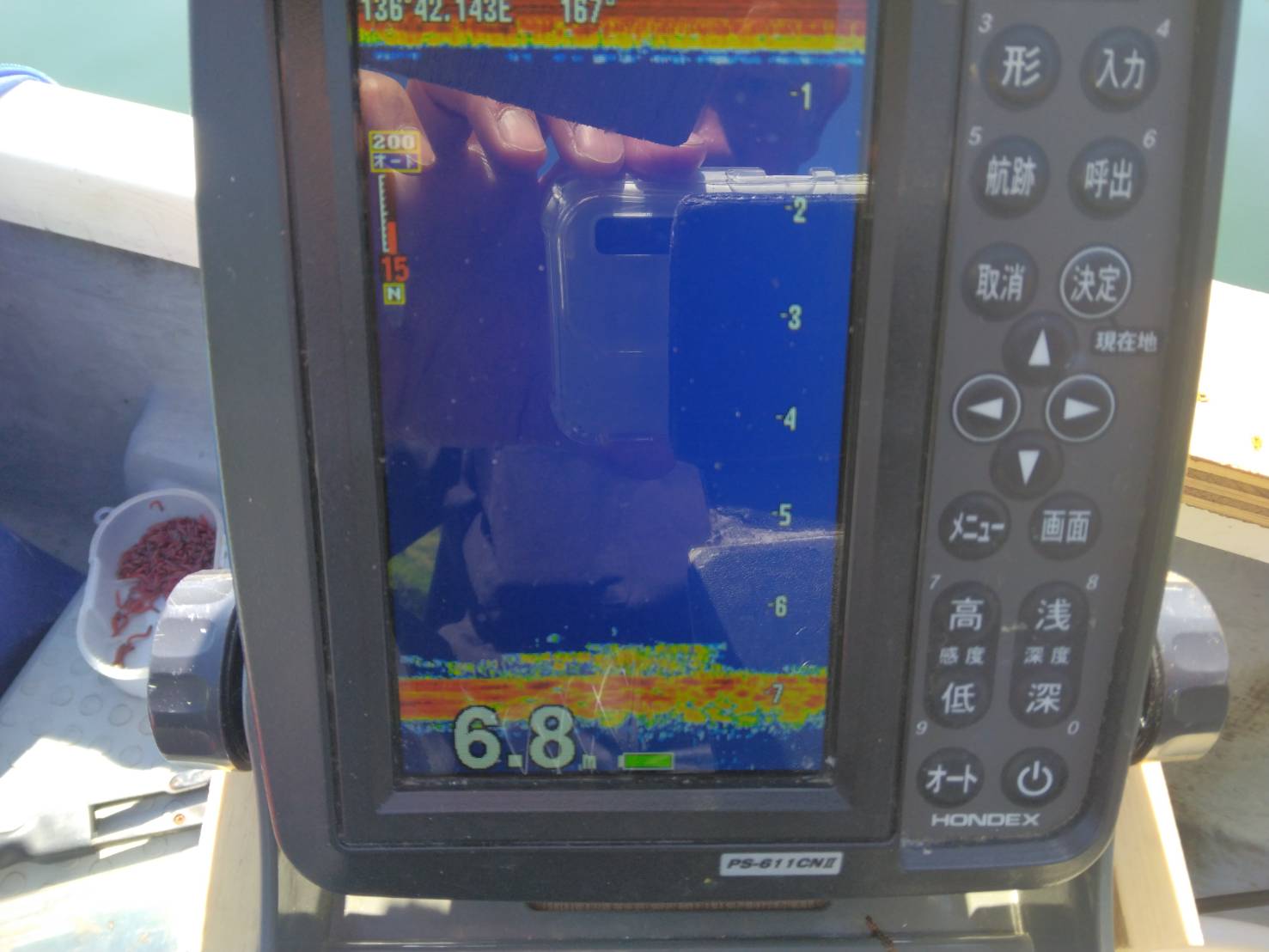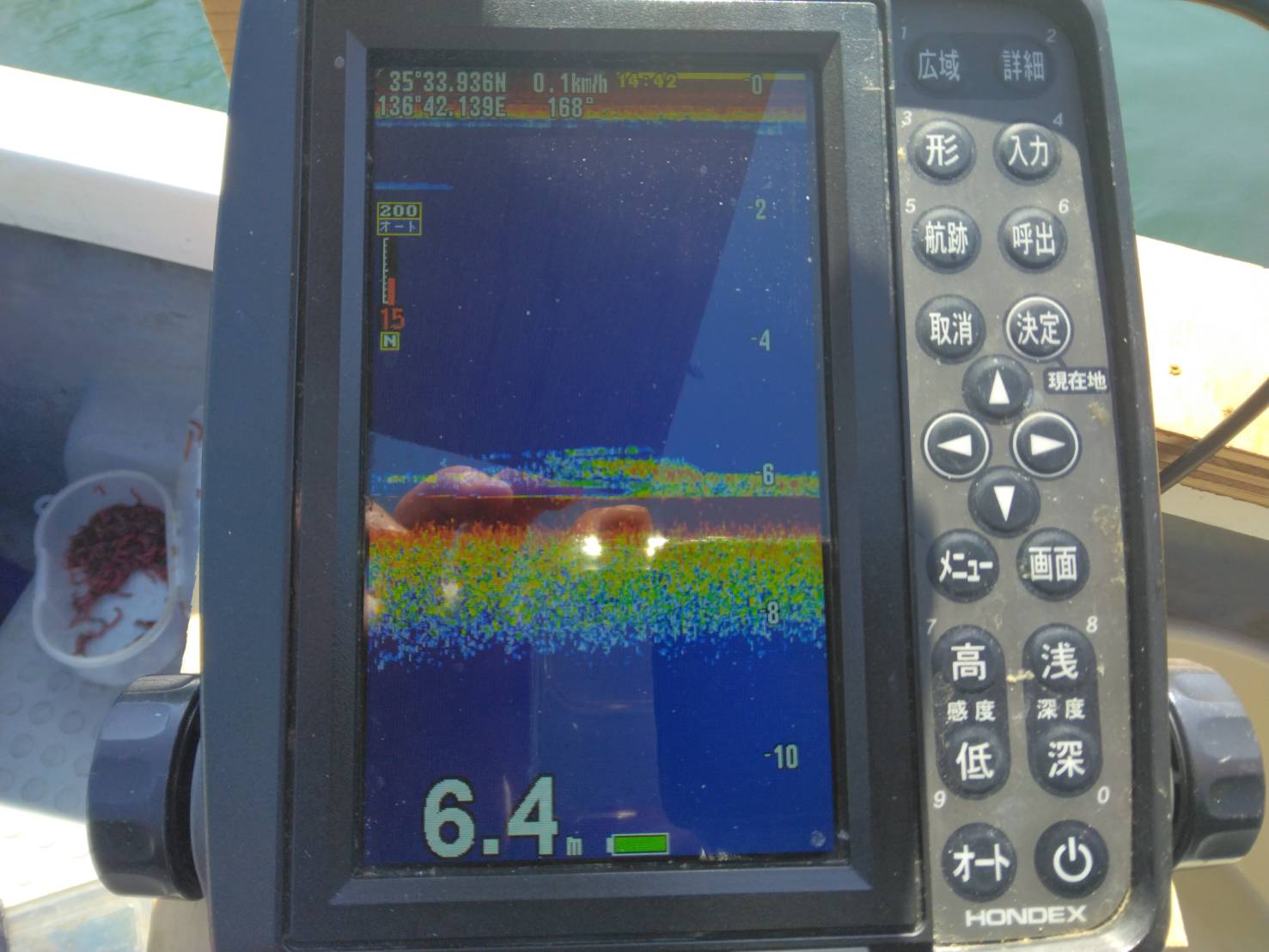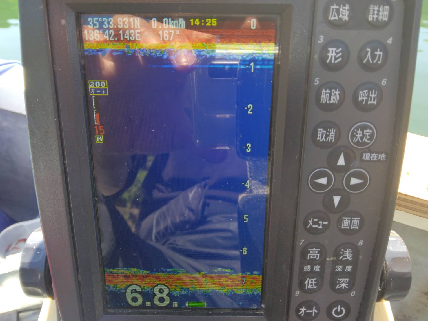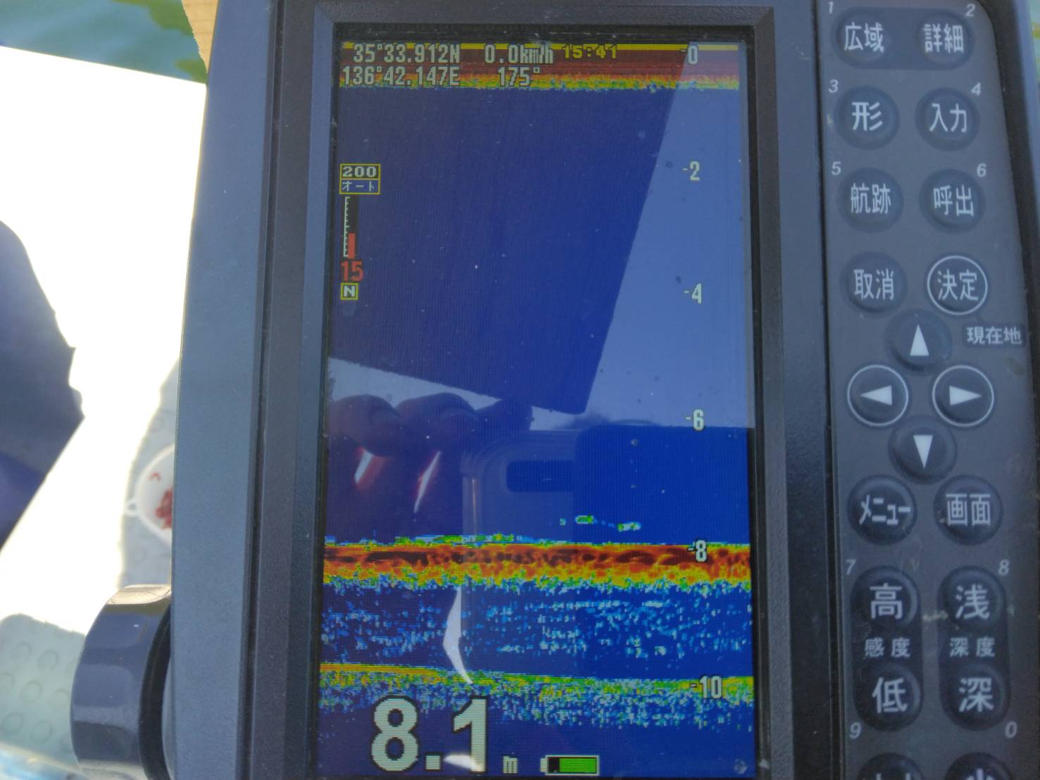 風が出てきてカーブミラーのブイ横に移動しましたが、ほとんど魚の反応は無くたまにこんなに反応でした。カーブミラーのブイ横では30分くらい調査しましたが2匹でした。