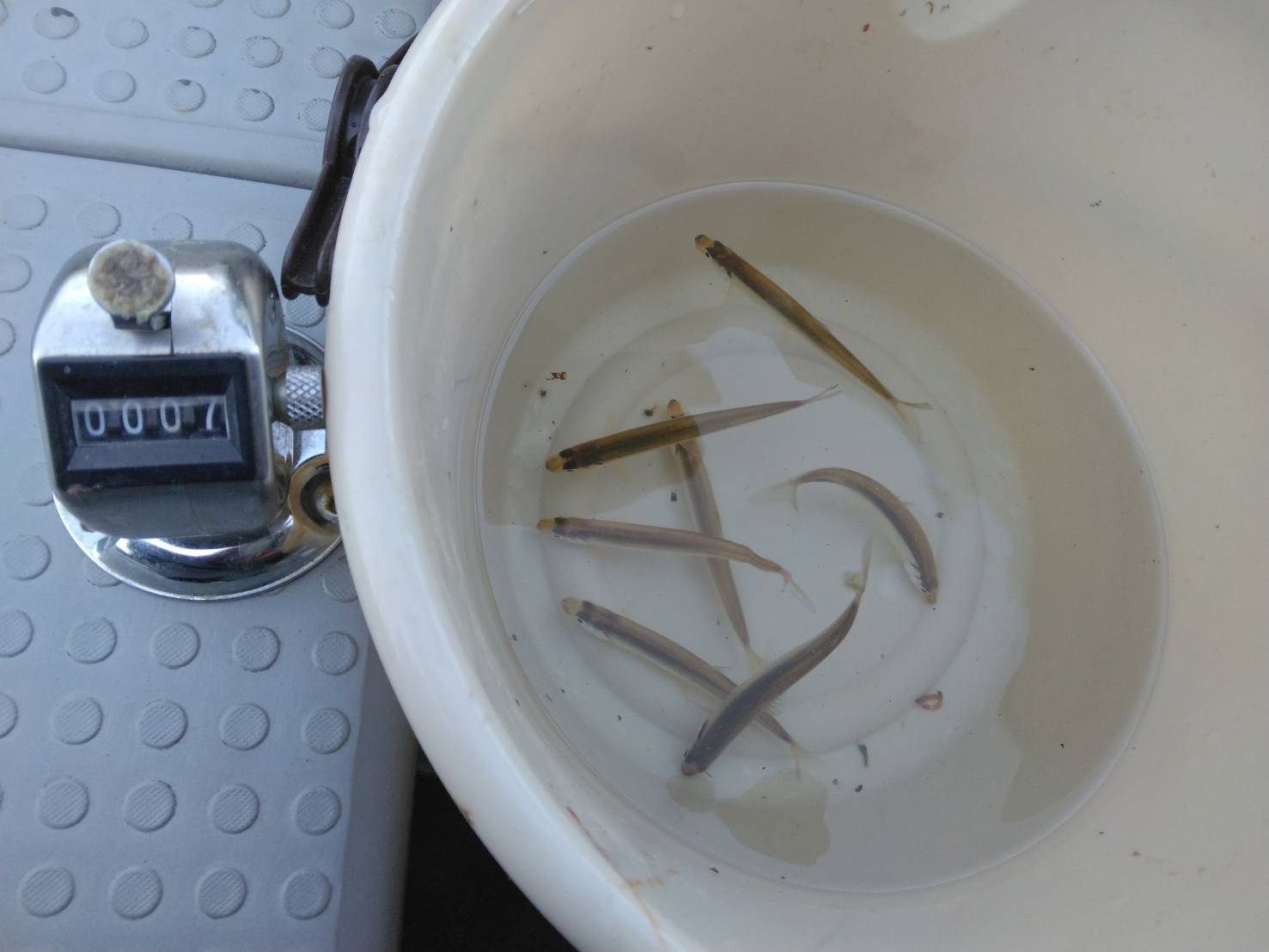 今日の調査結果は7匹でした。風の中でも釣れたのはよかったのですが、昨日と比べるとアタリも少なく魚探の反応が残念でした。伊自良湖のワカサギは気分屋さんです。明日はどこのポイントが良いのか私も探しますが皆さんも探してみて下さい。明日も皆さんの釣果に期待します。