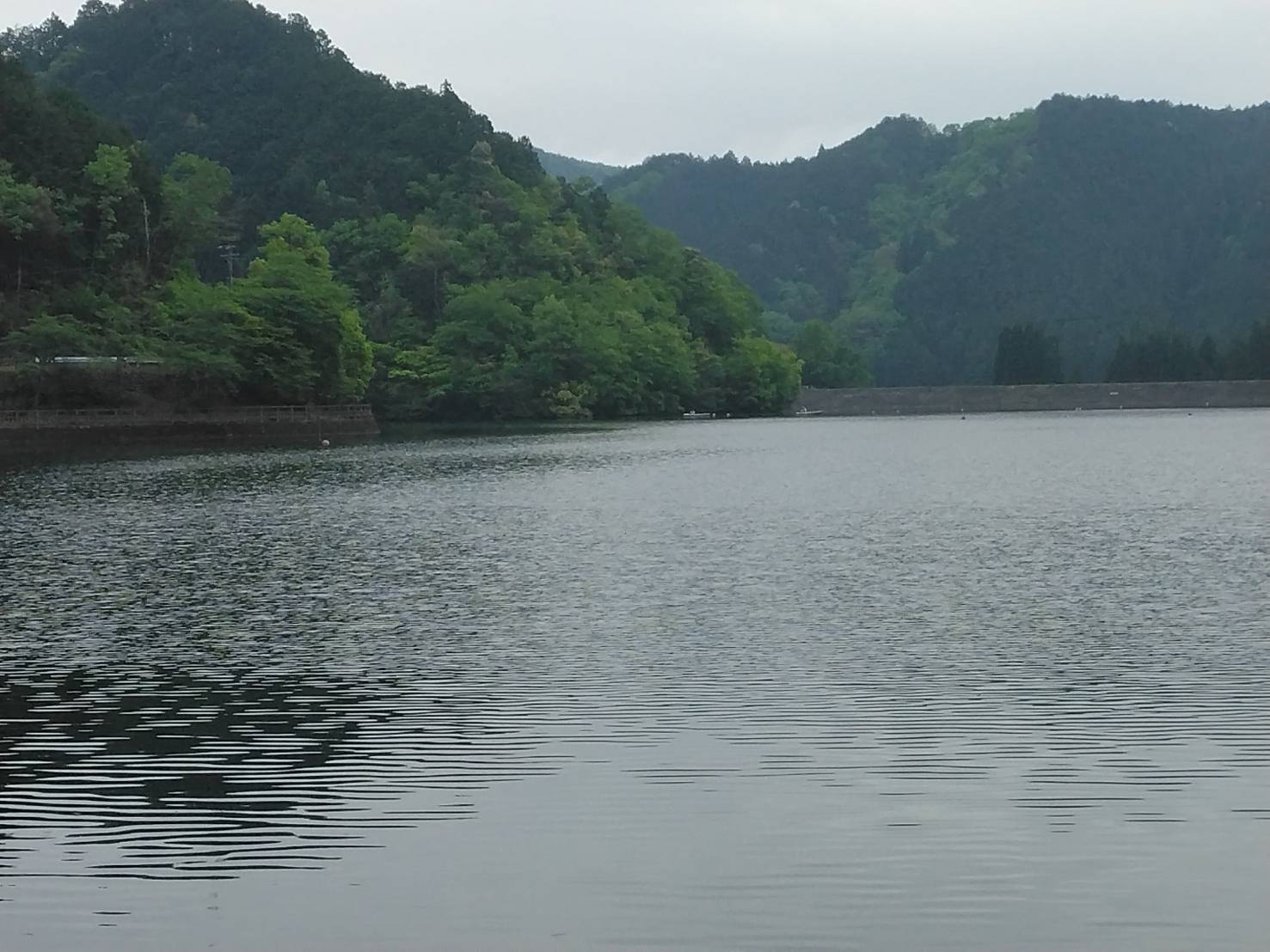 朝の伊自良湖 南ロープ、堰堤ロープにボートがいました。